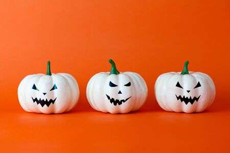 White ghost pumpkin on orange background with copy space , halloween concept.