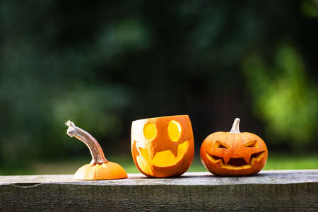 Halloween pumpkins or jack-o-lantern at home terrace. Decoration and holidays concept