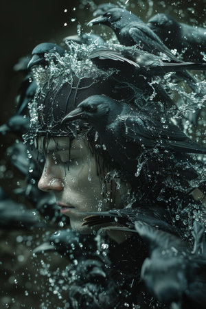 A man with a head full of birds and water, AI