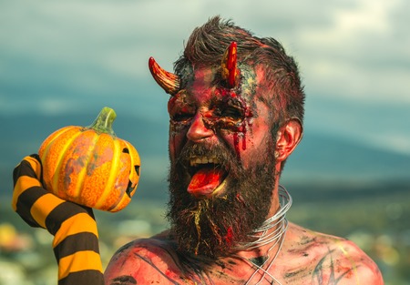 Halloween devil man holding pumpkin in striped sock. Demon with bloody horns on head. Satan with red tongue, beard, blood, wounds on face. Dragon with jack o lantern. Evil, horror, hell concept.