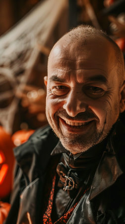 Mature Man dressed as Dracula vampire at a Halloween party, smiling with fangs. Concept of Halloween, costume party, vampire theme, festive celebration. Vertical.