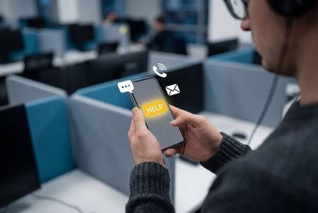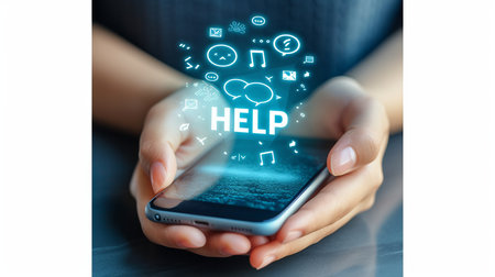Interactive holographic shining help text icon over mobile phone in hands, technology concept