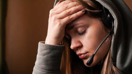 Portrait of young girl in a hoodie and with a headset. Tired call center worker