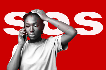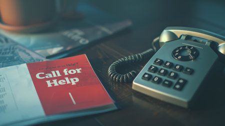 Urgent call for help with domestic violence pamphlet beside vintage phone. Raising awareness and supporting victims of abuse.