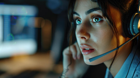 Close-up of female operator of call center using headphones to talk to the client