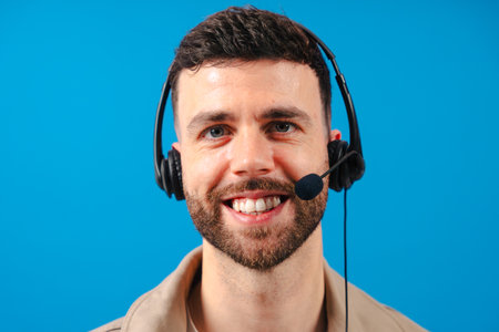 Smiling male customer support agent wearing headset closeup on blue background