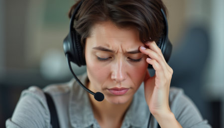 Close-up portrait of a desperate young woman listening to a single headphone with microphone during work as customer support with hand on forehand
