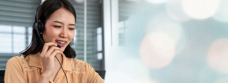 Happy smiling operator asian woman customer service agent with headsets working on computer in a call center.