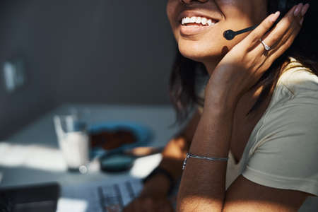 Call center employee wearing headset resolving customer concerns, speaking into microphone. Close up shot of customer service professional using headphones mic processing clients orders