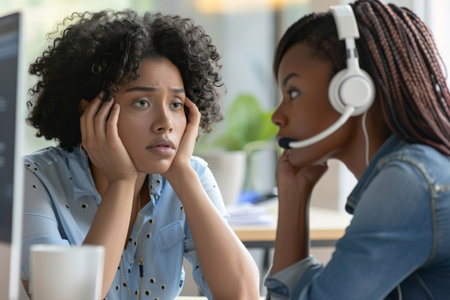 Empathetic customer service representative showing compassion towards a frustrated customer --ar 3:2 Job ID: a790457c-7813-419e-ac3f-5d8e0d1a8495