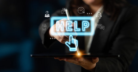 A hand reaches out to touch a glowing blue help button with a digital human hologram nearby.
