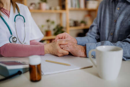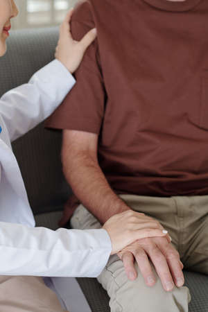 Close-up of doctor holding hand of senior patient and consoling him during medical visit at home.