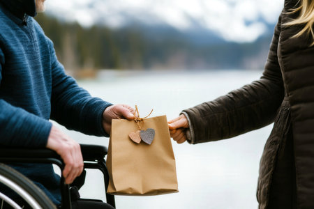 Close-up of hands exchanging a handmade kraft gift bag with heart decorations near a lake, one person in a wheelchair