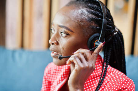 African american woman works in a call center operator and customer service agent wearing microphone headsets working on laptop.