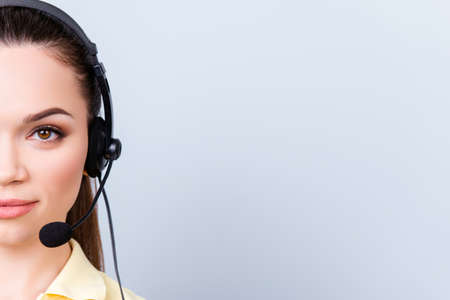 Half face portrait of a cute brunette call centre operator in a headset. She is isolated on a pure light background, looking above