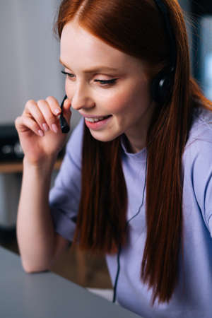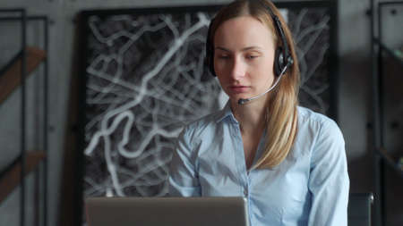 Close-up of friendly young woman operator using headset and laptop during customer support at home office. Young female student communicating online by video call on background of window.