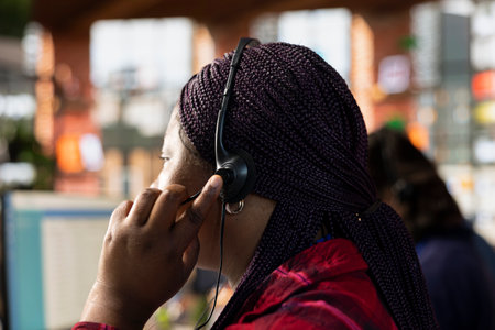 Customer support black engineer at help desk in photovoltaic facility answering calls on headset, offering assistance and support in fixing technical issues. Female operator on help line. Camera A.