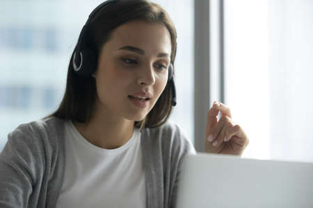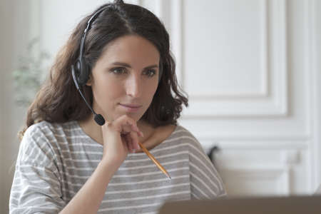 Focused young Italian entrepreneur lady wearing headset attentively listening educational webinar looking at laptop screen, getting remote online office trainings at home. Telemarketing concept