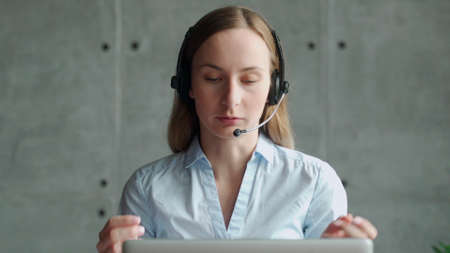 Close up woman wearing head set consulting client online, making video call, confident employee support service operator working, student learning language online, listening to lecture