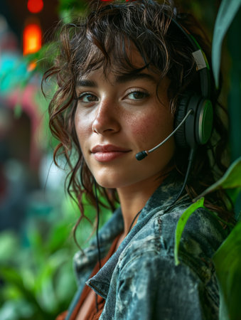 A woman wearing a headset looks off into the distance, engrossed in her thoughts.