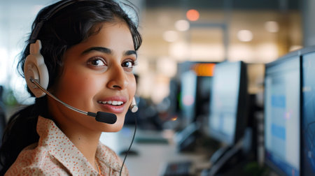 A young woman wearing a headset smiles at the camera in an office setting.