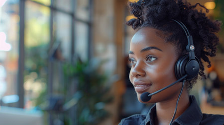 A focused woman with braided hair is wearing a headset and deep in conversation, highlighting the emotional connection in a professional environment.