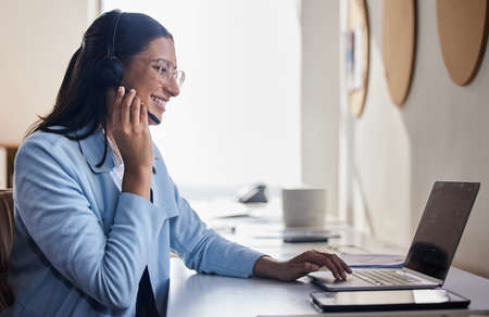 Telemarketing, laptop and woman with headset, office and communication for lead generation or sales. Call center, telemarketer and person with mic for consultation, online and discussion with contact