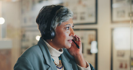 Mature woman, call center and talk at night with mic, headphones and customer support at telemarketing agency. Person, agent and consultation with voip tech, thinking and advice at modern office