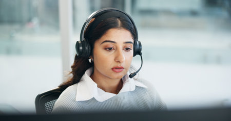 Woman, headset and tech in office for customer service, telemarketing and assistance. Sales agent, computer and reading in coworking space for insurance claims, company FAQ and call center schedule