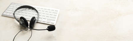 Headset with computer keyboard on gray background with space for text