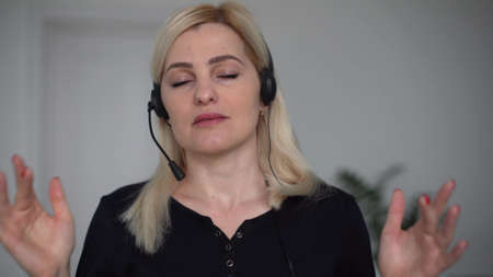 Telemarketing headset woman from call center woman in headphones speaking with client during her work at office