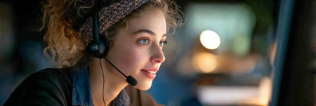 Dedicated young woman wearing a headset, focused on her work in a modern telework environment.