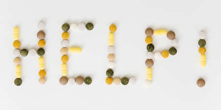 The word Help formed by loose white letters of printing on a black surface with copy space