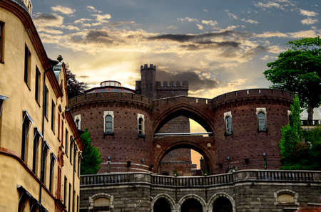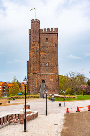 Helsingborg, Sweden - June 23, 2019: Medieval tower Karnan, part of a Danish fortress on the Baltic Sea next to Terrasstrapporna