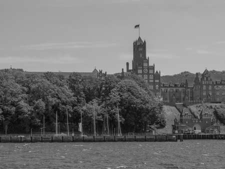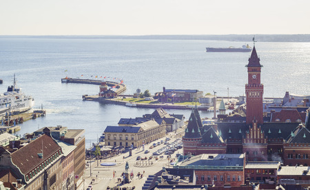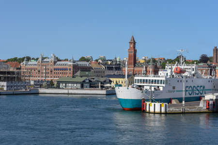 Helsinborg, Sweden - June, 2016: View of the city centre and the port of Helsingborg in Sweden. The ship is moored in port in Helsingborg harbour.