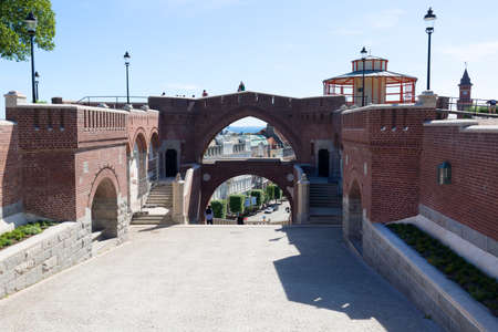 Helsingborg, Sweden - June 23, 2019: Terrasstrapporna, monumental staircase with terraces in the Konung Oscar II complex besides the fortress tower Karnan