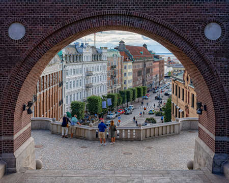 HELSINGBORG, SWEDEN - JULY 23, 2020: A view of Helsingborgs Stortorget main square from the steps that lead to karnan keep.