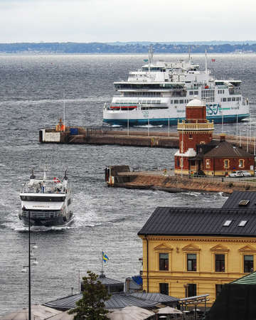 HELSINGBORG, SWEDEN - OCTOBER 06, 2020: An elevated view from the city of showing a couple of ferrys coming into port.