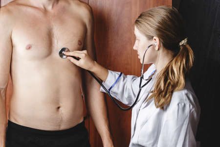 doctor listening to the patient's breathing through the stethoscope, the nurse listens to the heartbeat of the patient, examination of the patient