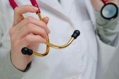 Red medical stethoscope.A doctor with a stethoscope.A doctor holding a stethoscope.The concept of healthcare.