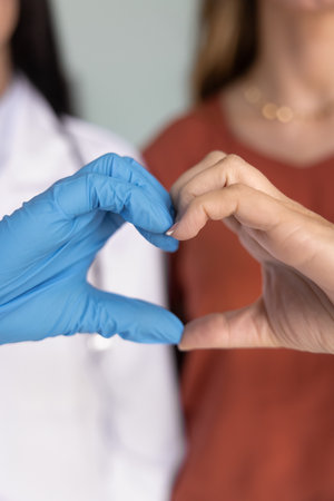 Female patient and doctor in rubber gloves making hand heart shaped gesture, joining fingers, showing symbol of love, healthcare, trust, medical support, kindness, charity. Vertical close up shot