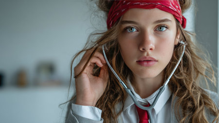 This captivating portrait features a young girl wearing a stethoscope and red bandana, reflecting a stylish approach to health and aspiration in a bright indoor environment.