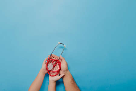 Adult and child hands holding red stethoscope on blue background with copy space for text. Top view, Healthcare medical concept
