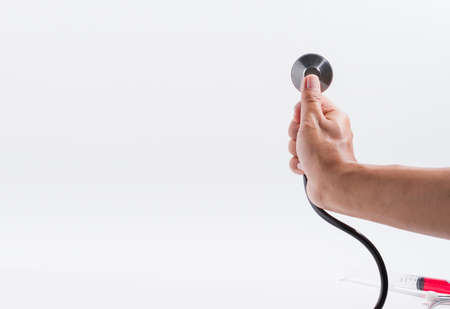 The doctor is holding the stethoscope to check the white background.