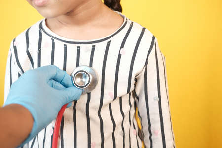 Doctor using a stethoscope checking child body, close up