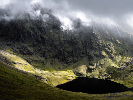 A view down grassy banks to Llyn Ffynnon y-gwas, a lake below the steep flanks of the west face of Snowdon, Wales, UK.