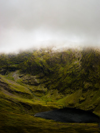 A breathtaking view of a verdant mountain shrouded in mist, its imposing form reflected in the inky waters of a secluded tarn below.