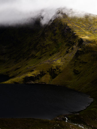 A breathtaking view of rugged mountains surrounding a serene dark lake in Ireland. The landscape is vibrant with mossy greens and hidden shadows from the clouds above.