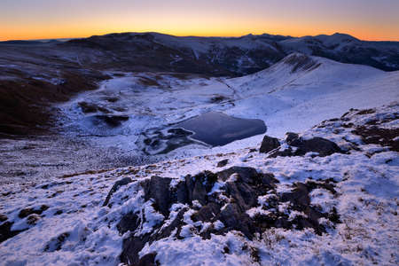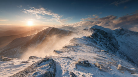 Last sun of the day on snow covered Snowdon Mountain. Landscape, telephoto