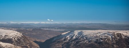 Small plane flying over mountains in Perthshire, Scotland. Summits of Cairngorms National Park covered in snow in the background.